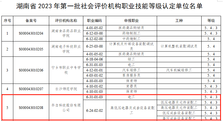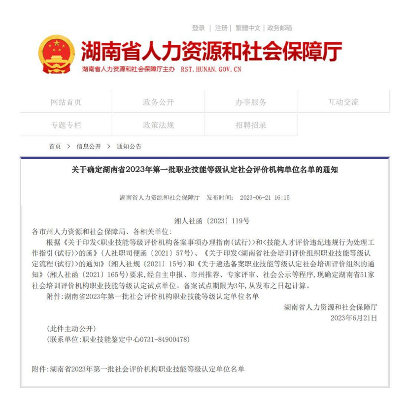 近日,湖南省人力资源和社会保障厅印发《关于确定湖南省2023年第一批职业技能等级认定社会评价机构单位名单的通知》,乐投平台等51家单位经专家评审确定具备职业技能等级认定社会评价资格。公司职业技能工作再上新台阶,可面向社会开展指定职业(工种)职业技能等级认定工作。