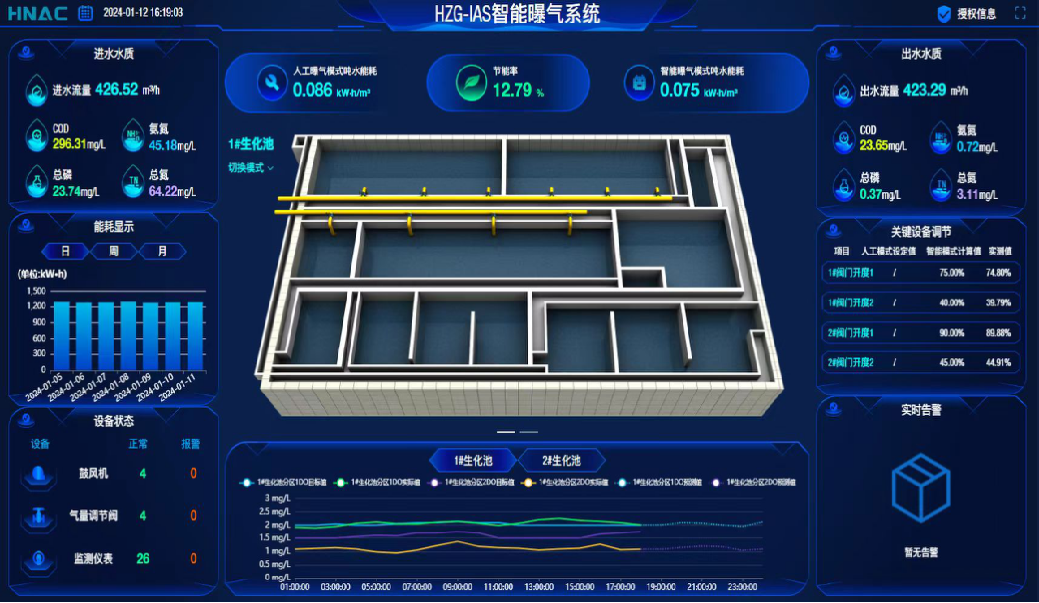 HZG-IAS智能曝气系统,优化了国际水协IWA的活性污泥数字模型ASMs,开发了模型预测控制MPC算法,对曝气量、溶解氧进行智能化、精细化及自适应控制。系统能够根据污水厂的实时进水水质、水量及生化池的关键状态变量,自动计算生化池各分区的实际需气量,并对鼓风机组和生化池曝气管路电动空气调节阀进行自动优化调节控制,按需分配各曝气控制区域的供气量。智能化的控制方式可保证生物处理过程的高效运行,并显著降低处理能耗和运营成本。同时,HZG-IAS智能曝气系统还强化了氨氮、总氮等关键污染物的处理效果,出水水质稳定,满足严格的排放及回用标准。HZG-IAS智能曝气系统的降碳减污效果显著,为污水处理厂蜕变为绿色低碳标杆厂提供了关键途径。