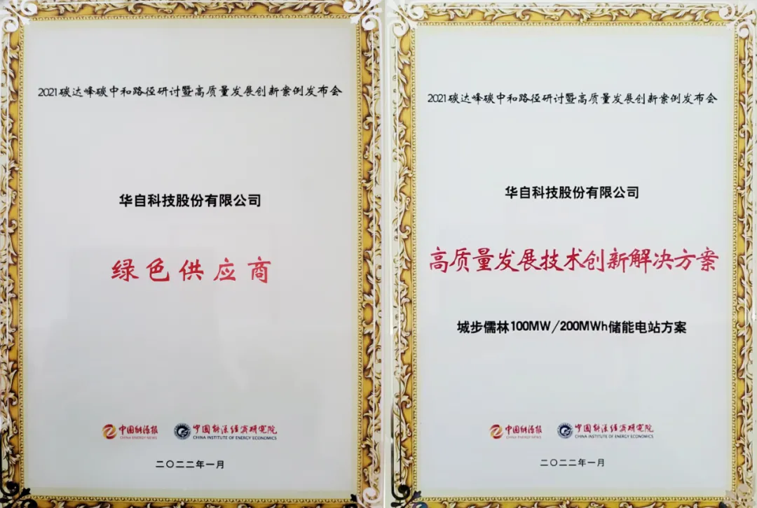 近日,由中国能源报主办,中国能源经济研究院学术支持的“2021碳达峰碳中和路径研讨暨高质量发展创新案例发布会”在北京举行。发布会上,华自科技以“城步儒林100MW/200MWh储能电站方案”获得“高质量发展技术创新解决方案”和“绿色供应商”两项荣誉。