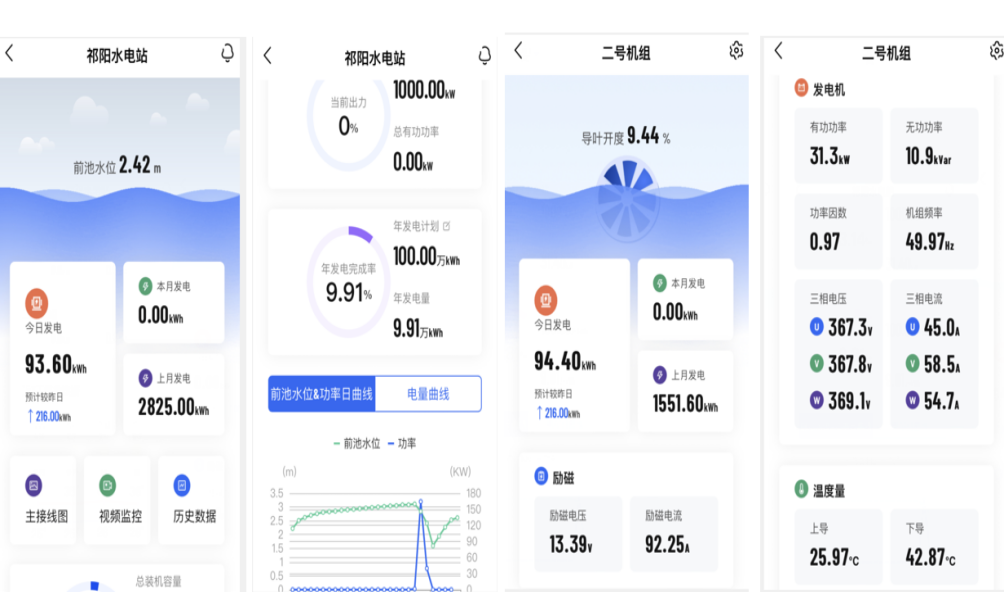 低压机组作为电站安全运行中的重要设备,须对其进行全方位实时监控。HZA100C低压机组一体化智能控制屏可通过Web端/手机APP对电站机组进行远程开停机、功率调节、报警查询、历史数据查询等操作,在一定程度上达到电站无人值班(少人值守)运行效果,为用户节省大量人力及管理成本。该产品已成功应用于湖南祁阳冷水源电站、湖南炎陵鲁坑电站、广东广宁湖洞电站、浙江金华兰溪城投一二级电站等项目,取得良好应用效果,有效保障设备安全稳定运行,提升电站水资源利用率和发电效益,预计每年可帮助电站提升发电效益3%-10%。