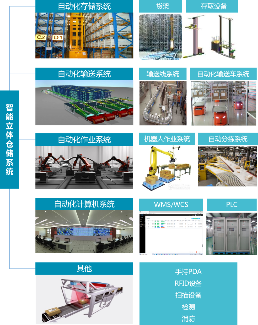 智能立体仓储系统主要由立体货架、堆垛机、出入库输送设备(输送机和AGV)、自动化输送系统、信息识别系统、自动化作业系统、WCS(仓库控制系统)、WMS(仓库管理系统)以及其他辅助设备组成,是一个高度自动化、智能化多系统信息融合的集成系统。