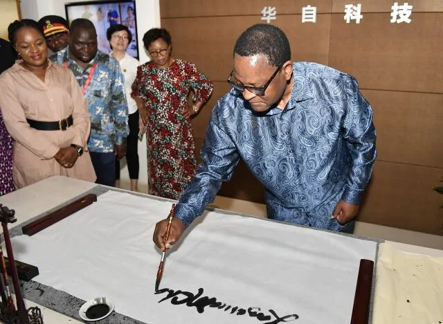 (6月30日,马拉维总统查克维拉在华自科技参观时签名。湖南日报全媒体记者 童迪 摄)