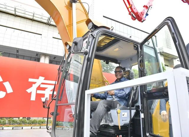 (6月30日,马拉维总统查克维拉体验三一集团挖机。湖南日报全媒体记者 童迪 摄)